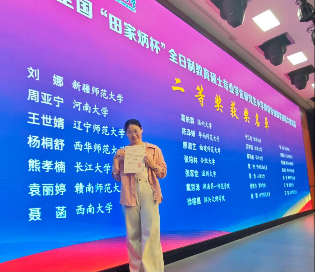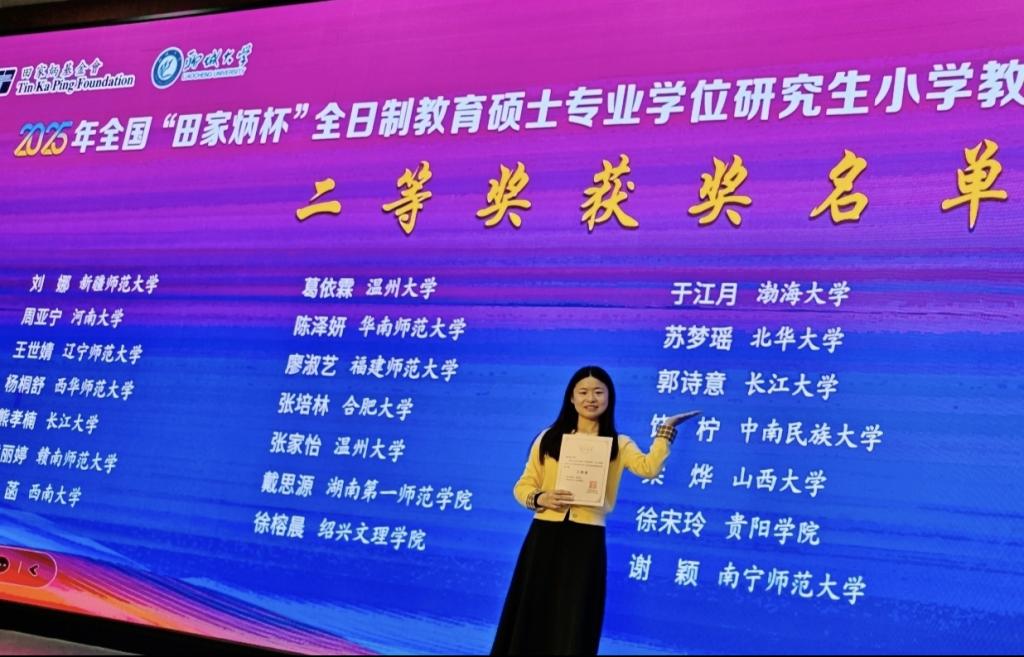 (通讯员 郭诗意)10月24日至26日,2025年全国“田家炳杯”全日制教育硕士专业学位研究生小学教育领域教学技能大赛决赛在聊城大学举办,同期举行了小学教育专业学位硕士研究生高质量培养研讨会。必赢官网小学教育研究生郭诗意、熊孝楠凭借扎实的教学功底与创新的教学设计脱颖而出,双双斩获二等奖,实现了学校在该赛事小学教育领域的历史性突破。