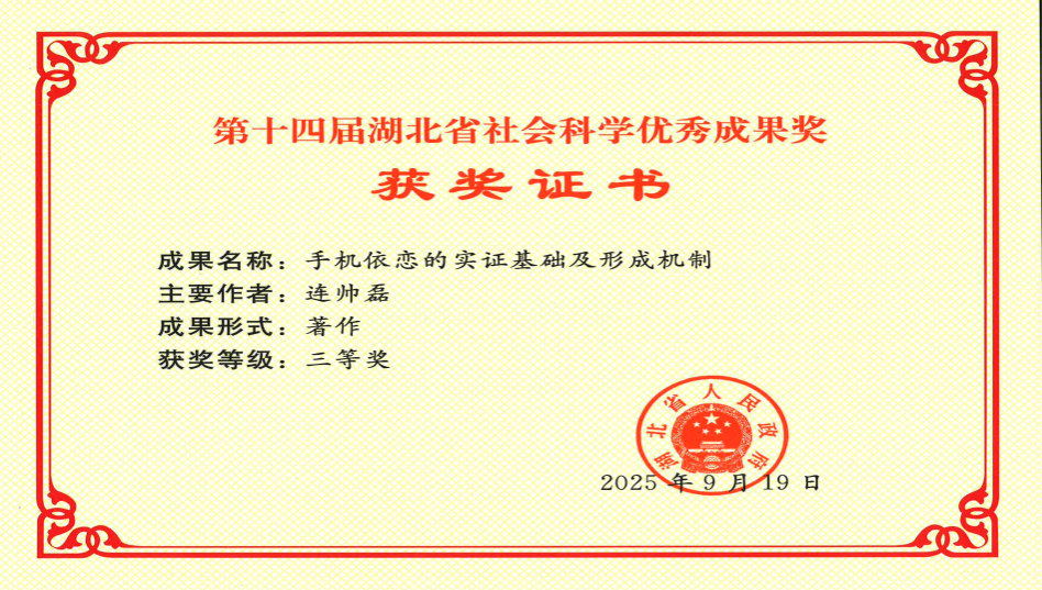 (通讯员 何巧楠)近日,湖北省社科成果奖证书颁发,必赢官网连帅磊副教授的专著《手机依恋的实证基础及形成机制》荣获第十四届湖北省社会科学优秀成果奖三等奖。这一奖项既是对其在数字时代行为心理研究领域创新探索的高度认可,更彰显出学院青年科研骨干过硬的科研实力与强劲发展潜力。
