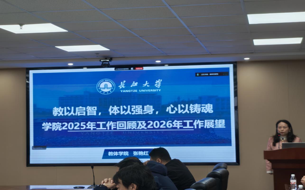 随后,张院长为全院教职工作题为“教以启智,体以强身,心以铸魂”的专题报告,报告全面回顾了学院2025年工作成效:学科建设稳步推进:教育专业博士点立项建设稳步推进, 体育学、教育学等学位点评估均获合格;科研突破成效显著:获批国家社会科学基金一般项目1项, 省部级科研成果奖实现层次与数量双提升;人才培养硕果累累:本科专业建设成效显著, 师生在教学竞赛中屡创佳绩, 研究生在全国"田家炳杯"等赛事中斩获10项大奖;育人模式特色凸显:国际化办学持续推进,"以体育人、以心育人、以教铸魂、以爱润心"的育人模式成效凸显,斩获全运会历史首枚奖牌;社会服务多点开花:承办多项国培、省培项目。同时, 报告也指出学院在学科特色凝练、平台项目成果突破、人才培养质量、师资队伍结构等方面仍需提升。