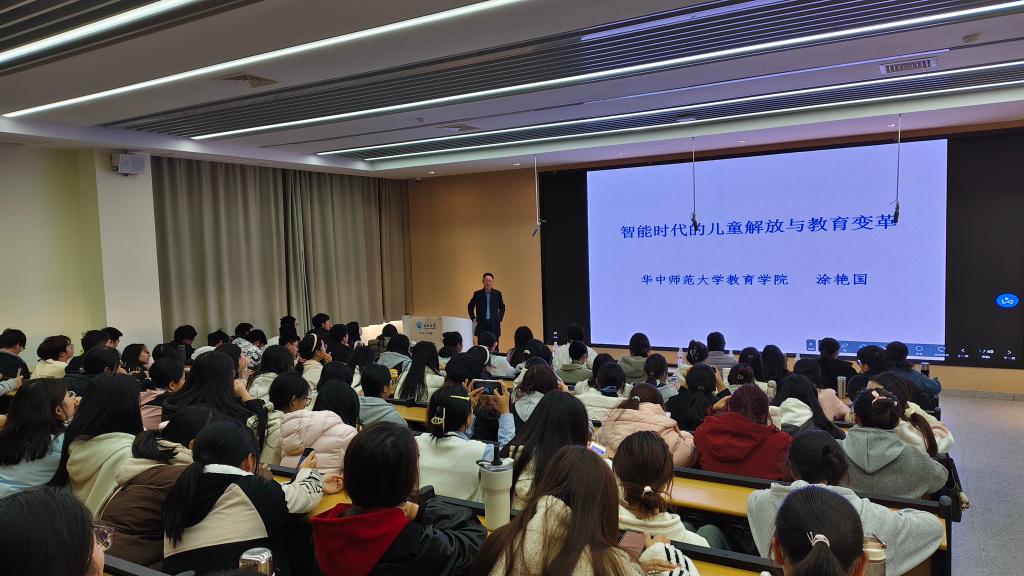 (通讯员 刘琦)2025年11月20日14:00,16教A109智慧教室座无虚席,一场以“智能时代教育新生态”为主题的精彩讲座如期举行。华中师范大学教育学院涂艳国教授担任主讲人,其中“儿童解放与教育变革”是本次讲座的核心议题。报告会由437bwin必赢国际官网院长张艳红主持,教育学专业本科生、研究生及教育系全体教师共计160余人聆听报告。