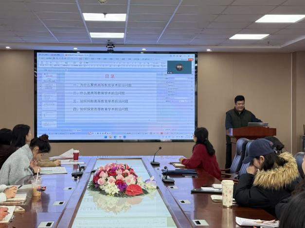 会上,于永伟老师以教育学术前沿问题为核心,作专题报告。报告围绕“为什么聚焦教育学术前沿问题、什么是教育学术前沿问题、如何判断教育学术前沿问题以及如何探索教育学术前沿问题”四个维度进行系统阐释。他深刻剖析了锚定学术前沿对于学科建设、人才培养与科研创新的核心价值,清晰地界定了教育学术前沿问题的核心内涵与本质特征,明确了学术前沿问题的判断标准与识别路径,并结合自身科研与教学实践经验,为在场师生探索前沿选题、开展高质量学术研究提供了可落地的方法指引与实践思路。