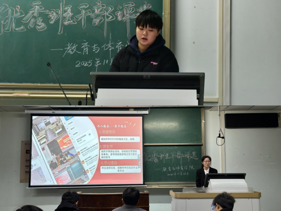 在答辩会现场,各位候选人依次登台,他们结合自身的任职经历、工作成果以及未来规划,进行了精彩绝伦的陈述。他们之中,有统筹班级各项事务的“班长兼团支书”,也有专注于学风建设的“学习委员”;有负责安全与生活事宜的“副班长兼安全委员”“寝室长”,还有在组织、宣传、体育等岗位上默默付出的各类委员。每一位候选人的陈述,皆是对责任与担当的生动演绎,充分彰显了教体学院学生干部队伍卓越的组织力、执行力和思考力。
