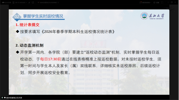 会后,学院以年级、班级为单位线上全覆盖召开返校安全教育班会,辅导员、班主任全员参会,为全体学生开展系统性返校安全教育。班会围绕安全出行、消除安全隐患、提防诈骗、远离不良网贷、到校管理、身心健康、寝室安全、网络舆情安全八大要点,向学生详细讲解返校注意事项:明确2月28日、3月1日报到注册、3月2日正式上课的时间节点,以及宿舍开放安排;要求学生返校前确定行程并告知家长,通过正规渠道购票,做好出行防护;返校后严格遵守宿舍管理规定,自查消防隐患,杜绝使用大功率电器,做好寝室水电、财物安全防护;提醒学生增强防诈和网贷风险意识,不泄露个人信息、不轻信陌生来电短信,树立理性消费观。