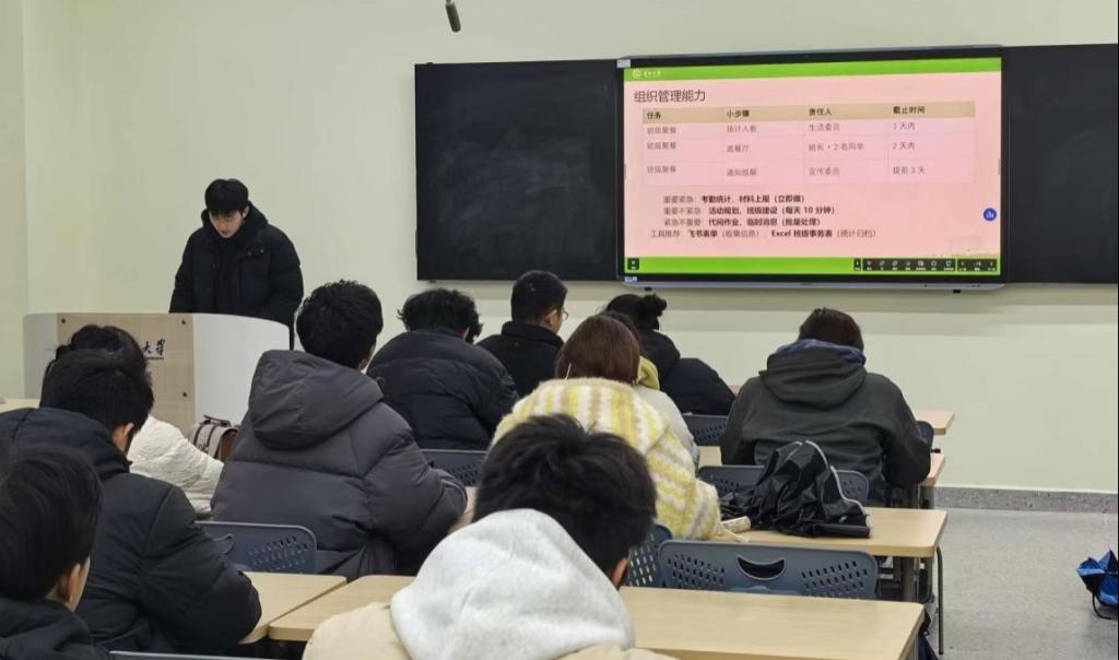 培训会在庄重而温馨的氛围中拉开帷幕。刘季米学长结合自身丰富的班级管理经验,系统阐述了班干部在班级建设中的核心作用。他重点分享了如何有效管理班级事务、发挥桥梁纽带作用,要细化工作内容,做到工作落实,解除了班干部对自身角色的一些“误区”以及在实践中提升组织管理能力的途径,在沟通表达能力方面,从对接老师,沟通同学,公开表达三个层次进行深入分析,明确了班干部要做靠谱的服务者。
