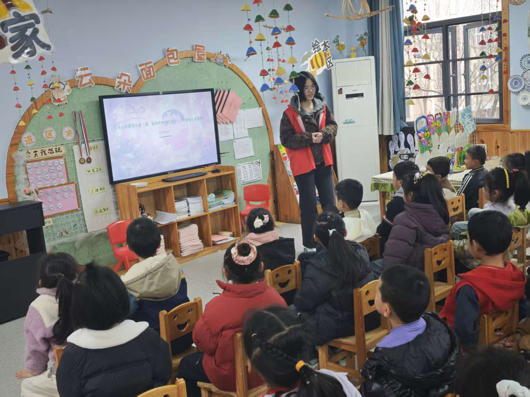 活动现场,志愿者们分工协作、默契配合。带队志愿者清点人数后,宣讲活动正式拉开帷幕。志愿者余奕航借助生动有趣的PPT,用浅显易懂的语言为小朋友们讲解植树节的由来、树木的生态作用,让孩子们直观认识到保护绿植、守护地球的重要性。讲解过程中,志愿者们还组织小朋友开展画画互动活动,引导孩子们用画笔描绘心中的绿色家园,同时协助幼儿园老师维持现场秩序,让活动在轻松愉悦的氛围中推进。志愿者们以饱满的热情、温柔的态度与孩子们互动,将绿色环保的理念深深植入孩子们心中。